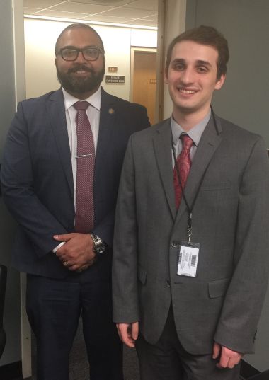 Honors College student Michael Allain, right, on the job with state Sen. Kevin Thomas of Long Island, who chairs the Committee on Consumer Protection. |