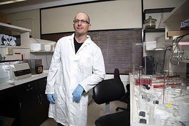 Damian Zuloaga stands in his Biology Building laboratory. (Photo by Patrick Dodson)