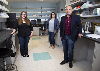 Andrew Poulos stands in the LSRB's Poulos Research Laboratory with Ph.D. students Natalie Odynocki (left) and Lorianna Colon. Both are part of his research team participating in a $1.89 million NIMH study into fear. (Photos by Patrick Dodson) |