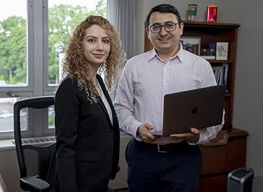 Shaghayegh Sahebi, left, and Reza Feyzi-Behnagh are using a new NSF grant to detect procrastination in online learners and find ways to improve these learners' self-regulation. (Photo by Brian Busher)