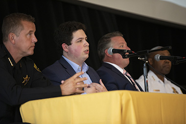 SUNY Student Assembly President Austin Ostro, second from left, speaks at the Our Community, Our Health, Our Future Town Hall meeting on October 1. Photo by Patrick Dodson. |