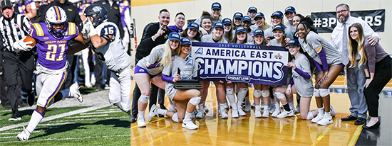 Karl Mofor, at left, scored three touchdowns and led UAlbany to victory at Stony Brook; at right, Volleyball celebrates its America East Championship victory in University Gym. (Photos by Bill Ziskin)