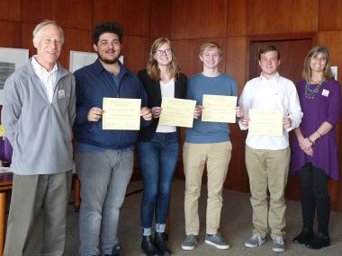 Constitution Day Essay Contest. From left: James Acker, distinguished teaching professor, School of Criminal Justice; honorable mention winners Jayden Fritz-Berrios, Joanna Ogrodnik and Jacob Weissenburg; essay contest winner Mark Marinkovic; and Martha Asselin, director of the Center for Leadership and Service. Not pictured are honorable mention winners Fiona Butler, Jamila Desir and Ankeith llliparambil. |