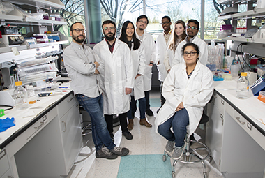 Paolo Forni, at left, stands with his student research team in his Life Sciences Research Building laboratory: left to right, Joshua James, Jennifer Lin, Ed Zandro Taroc, Emmanuel Adade, Alison Pehl, Raghu Katreddi and Ankana Naik. (Photo by Patrick Dodson) |