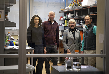 Women of science and male ambassadors get together in the Life Sciences Research Building. Left to right, Kristen Corbosiero of DAES, Ken Halvorsen of the RNA Institute, Edelgard Wulfert, former CAS dean, of Psychology, and Andy Berglund of Biology. (Photo by Patrick Dodson) |