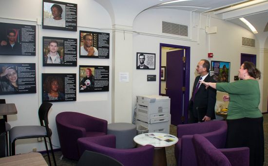 JoAnne Malatesta shows President Havidán Rodríguez around the offices for Undergraduate Education and Advising Services. (UAlbany photo)