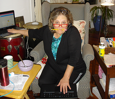 Psychological Services Center office manager Carrie Fonda strikes a humorous pose with some of the tech paraphernalia she requires to balance the center's new shift to teletherapy. |