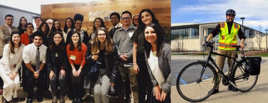 At left, Assistant Professor Hillary Wiener (center, in red) is pictured with her marketing students during a field trip to New York City. At right is Gary Ribis, biking to campus as he does year round. (Provided photos) |