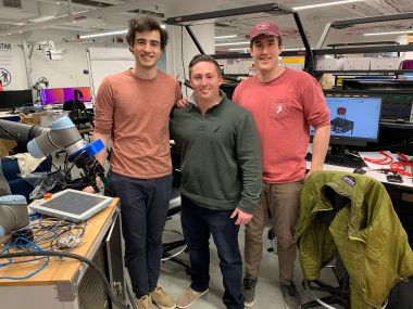 UAlbany alum Nick Domnisch, center, is pictured with engineers Noah Pacik-Nelson, left, and Justin Schroeder, both students at the University of Connecticut, at the workspace of The Ventilator Project in Boston. (Provided photo) |