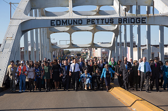Marchers, including Congressman John Lewis, President Barack Obama and President George W. Bush cross the Edmund Pettus Bridge on the 50th anniversary of "Bloody Sunday." The 2015 event shows how the reconciliation image teaches the political lesson of identity becoming different in the image of difference, according to Professor of Political Science Morton Schoolman.
