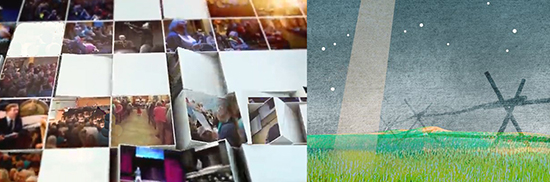 At left, an image from the Texas-based choir Conspirare, which is partnering with UAlbany on the video premiere a 477-member virtual global choir production of "All of Us" from the oratorio Considering Matthew Shepard. At right, an illustration by Karin Elsener which adorns the album cover of the oratorio, a tribute to a gay man brutally murdered in a Wyoming field in 1998. |