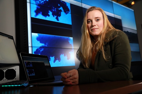 Graduate student Vanessa Przybylo uses a machine learning model to sift through cloud particle images in the xCITE Lab. (Photo by Patrick Dodson) |