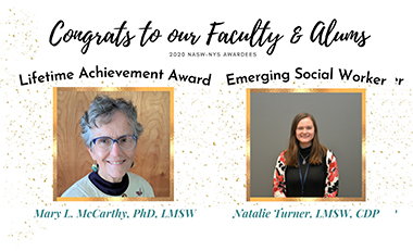 ALBANY, N.Y. (Nov. 24, 2020) — School of Social Welfare faculty member and alum Mary McCarthy (MSW ’82) and recent alum Natalie Turner (BSW ’17, MSW ’18) will be honored with awards from the National Association of Social Work, New York State chapter, on Dec. 4.