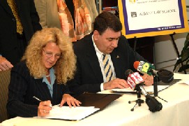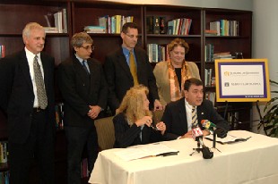 (Standing) Victor Rauscher, Albany Law School; Donald Siegel, Dean, UAlbany School of Business; Richard Ludwick, Albany Law School; Susan Phillips, Interim Provost, UAlbany. (Sitting) Connie Mayer, Acting President/Dean, Albany Law School; George M. Philip, Interim President, UAlbany. (Photo Mark Schmidt) |