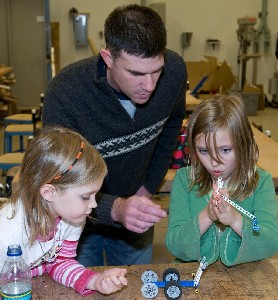 Coaches work with student teams to present Legos projects designed to answer real world questions through technology. |