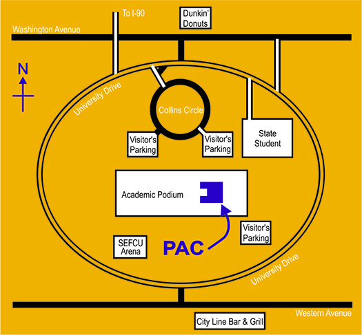From the North: Follow Interstate 87 South to Exit 1 and Interstate 90 East to Exit 2. Proceed directly across Washington Avenue onto the campus. Turn left on University Drive. Make first right onto Collins Circle for Visitor parking (fee charged).
