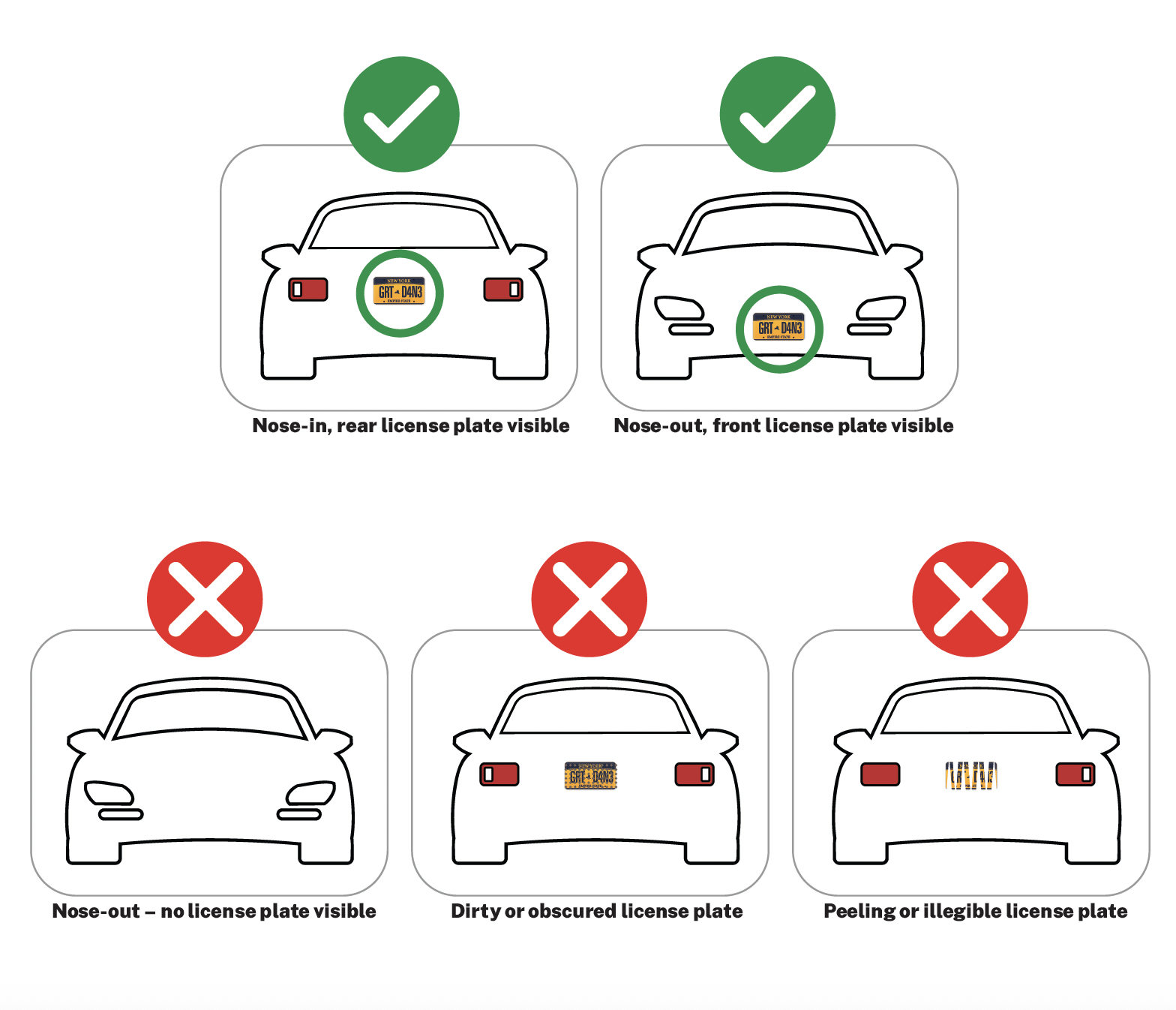 Vehicles must be parked so that a license plate is viewable from the driving lane. For vehicles registered in jurisdictions that do not issue front plates (such as Pennsylvania), this typically means the vehicle will need to be parked “nose-in.”