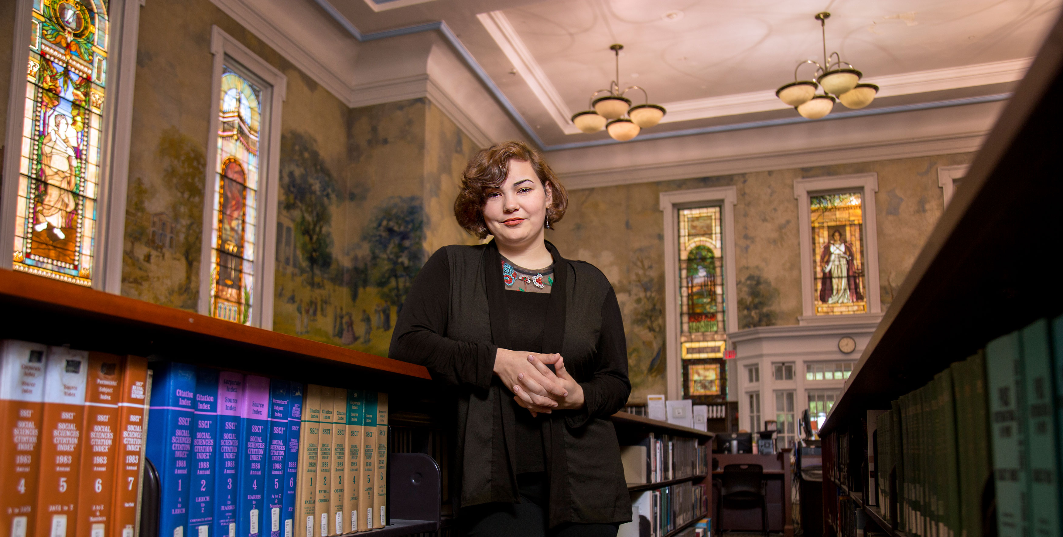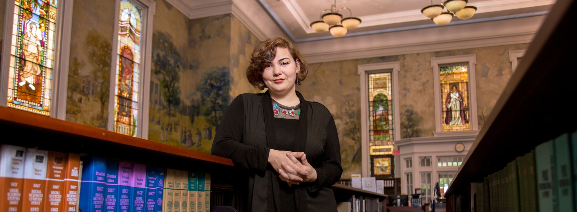 • A woman in a black sweater stands inside an ornately decorated library. A woman in a black sweater stands inside an ornately decorated library.
