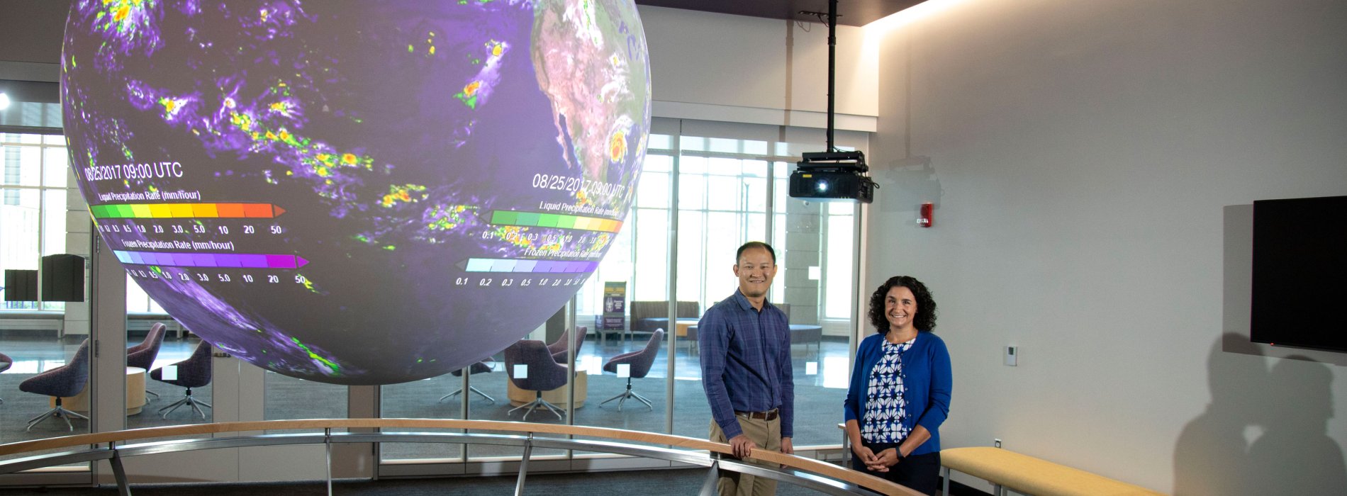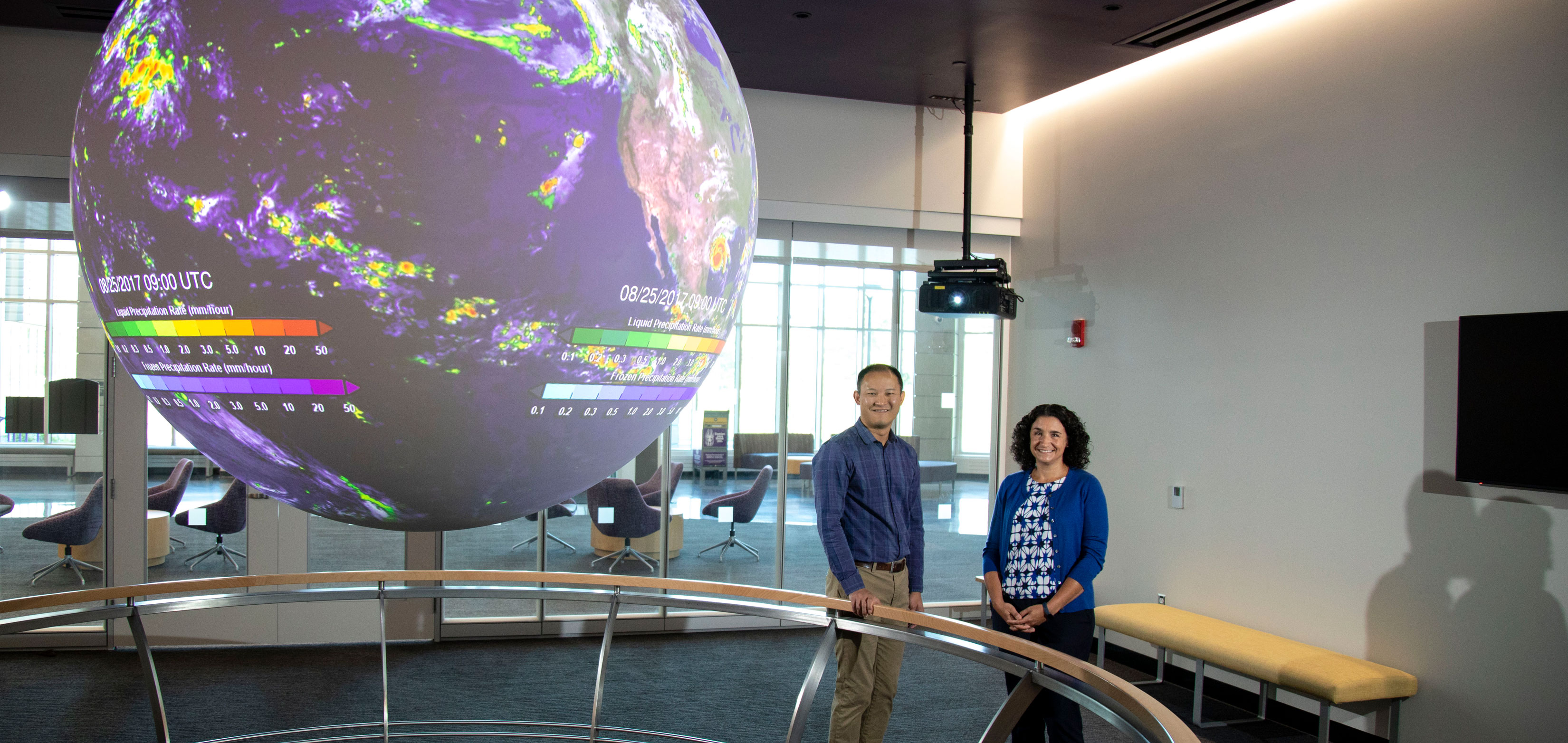 • A man and a woman stand and smile for a camera in front of a huge digital globe showing live weather patterns. A man and a woman stand and smile for a camera in front of a huge digital globe showing live weather patterns.