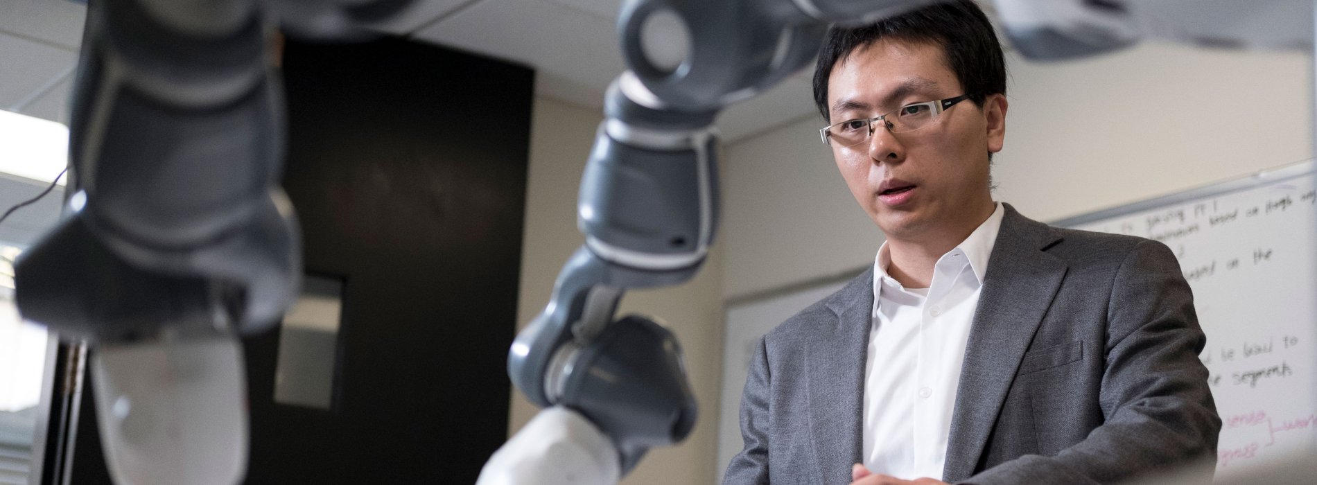 • A man in a suit and eyeglasses uses a remote control with a large red button to control two robotic arms. A man in a suit and eyeglasses uses a remote control with a large red button to control two robotic arms.