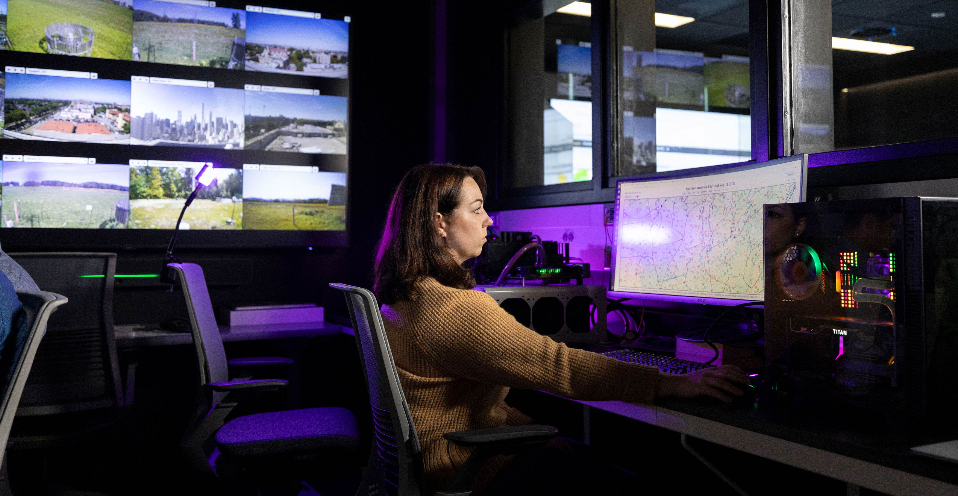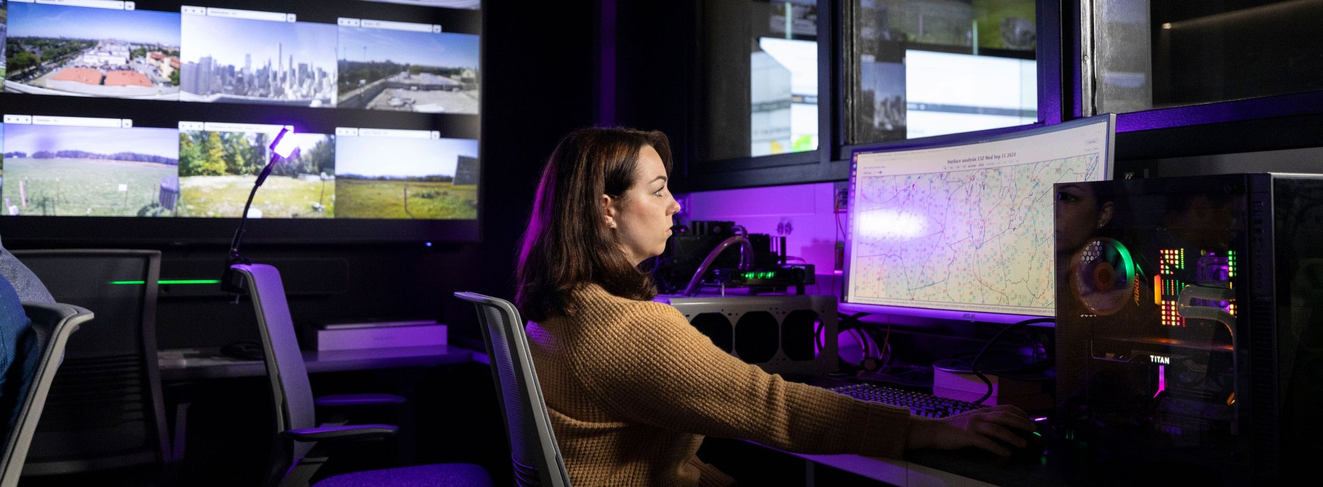 • An xCITE Laboratory researcher sits in front of multiple computer monitors to review a map with a data overlay. An xCITE Laboratory researcher sits in front of multiple computer monitors to review a map with a data overlay.