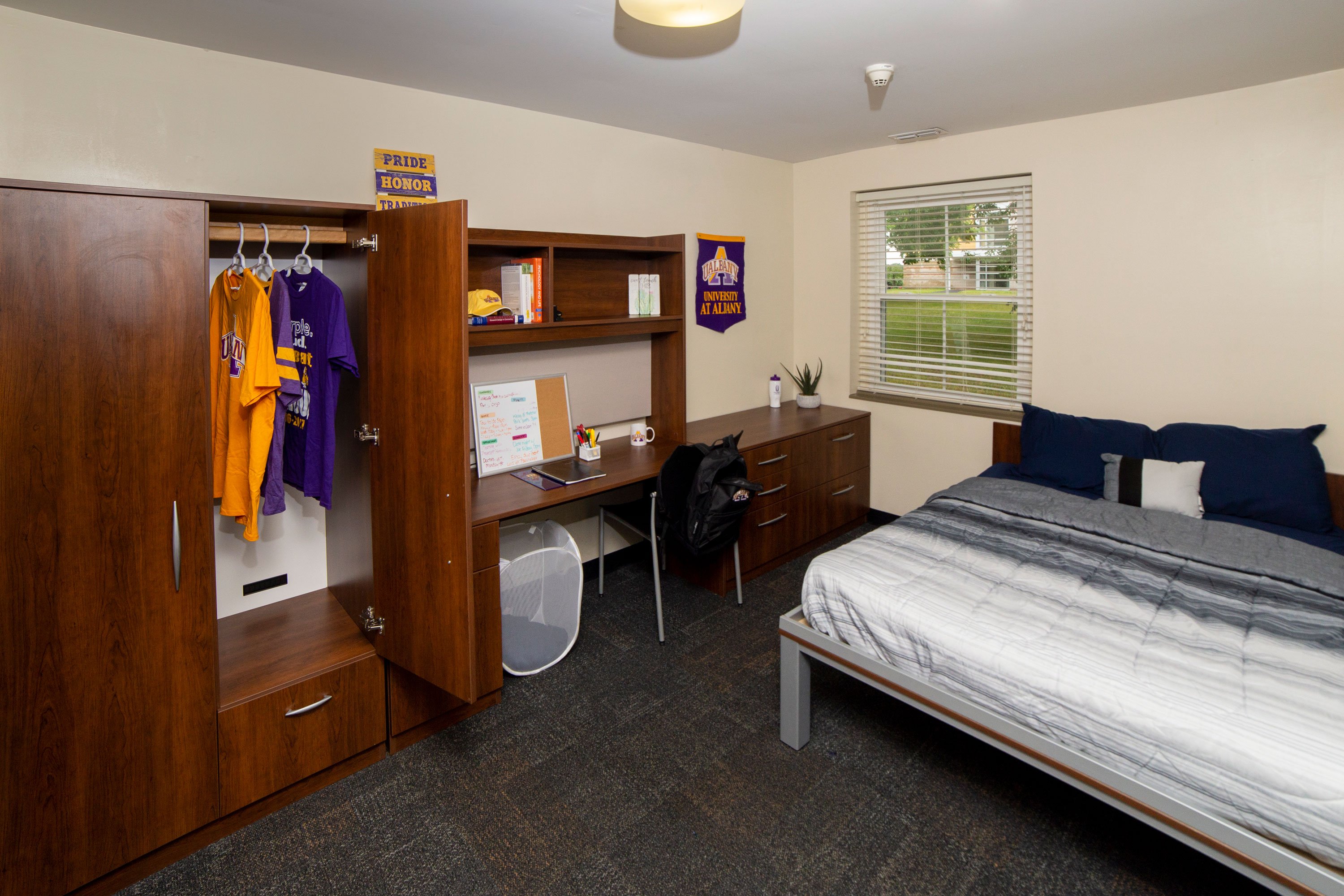 - Bedrooms: All Empire Commons bedrooms are singles, with four bedrooms in every apartment. Each bedroom comes fully furnished, with a full-sized mattress and bed frame, a chair and desk, and a dresser.