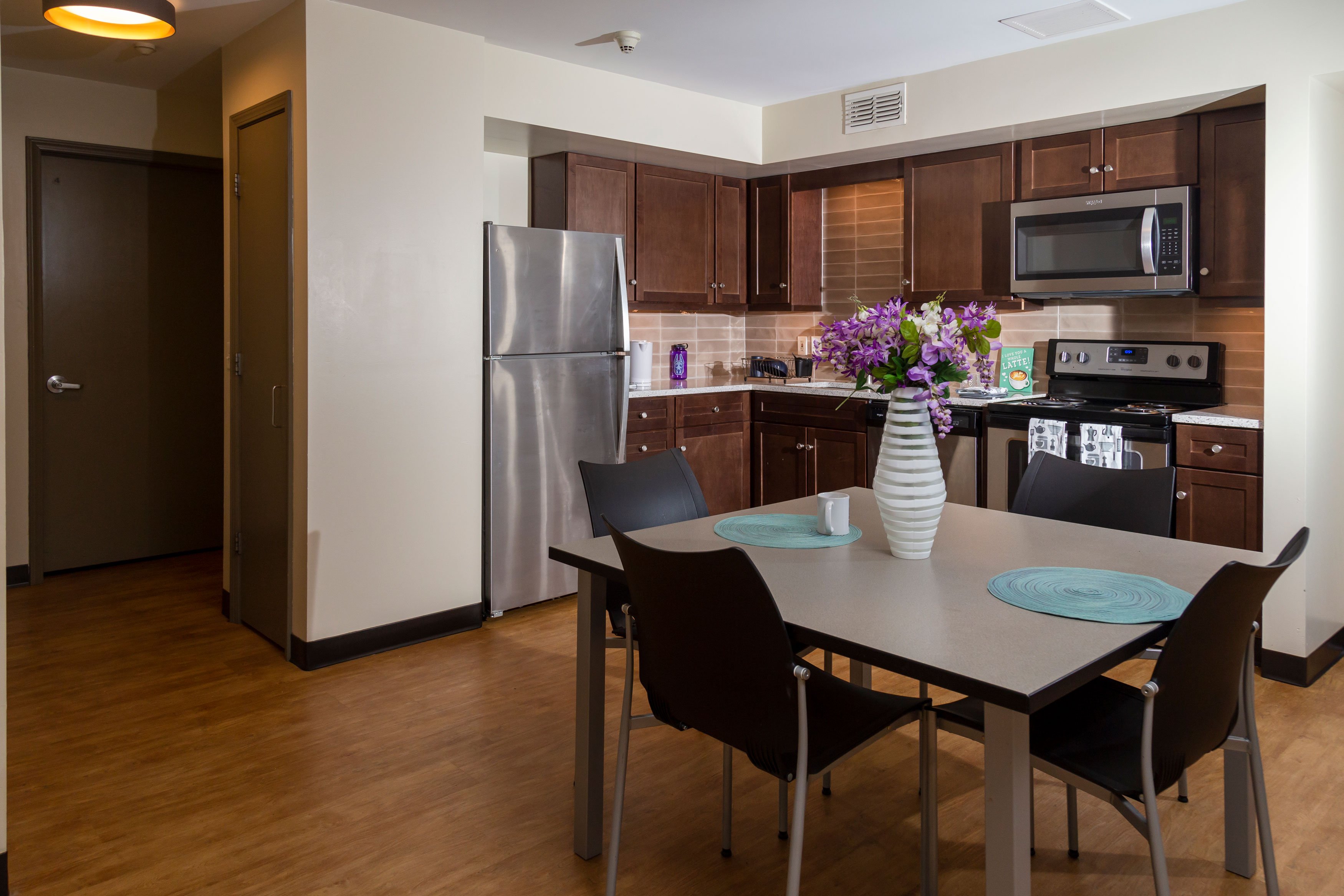 - Kitchens: Kitchens are fully equipped with a full-sized refrigerator, oven, stove range, microwave, garbage disposal and dishwasher. A dining table, chairs and ample cabinet space are also provided.