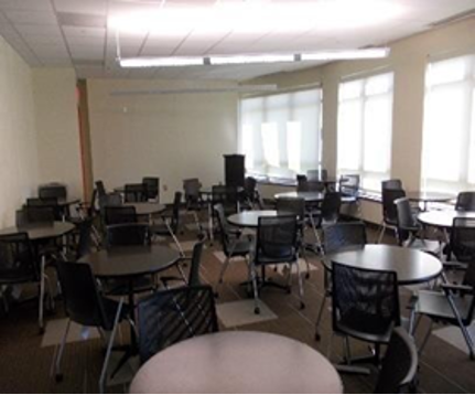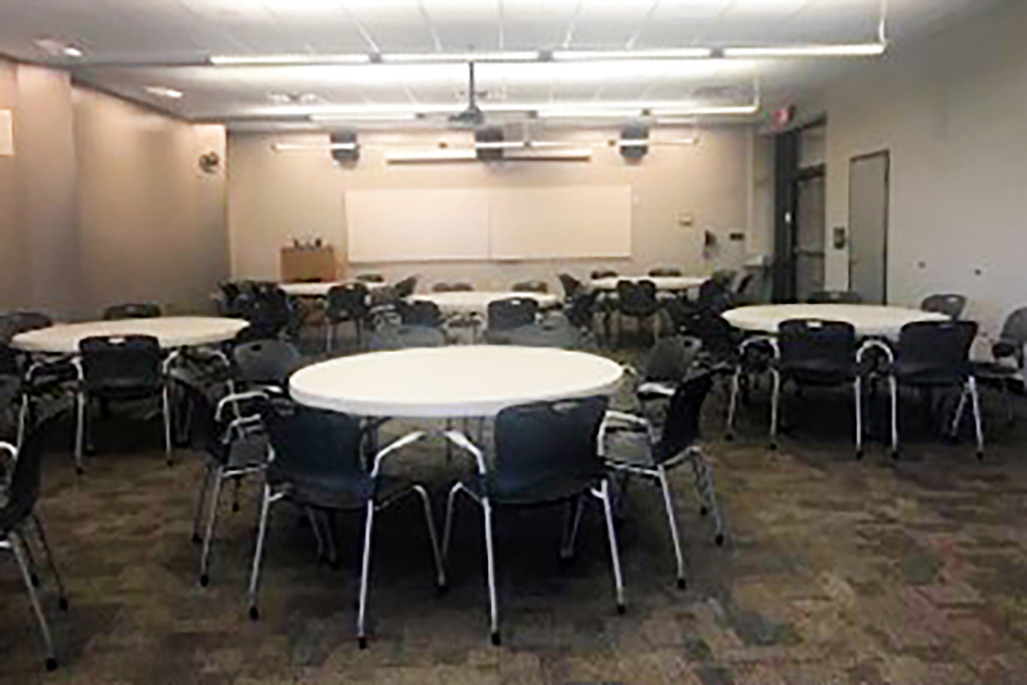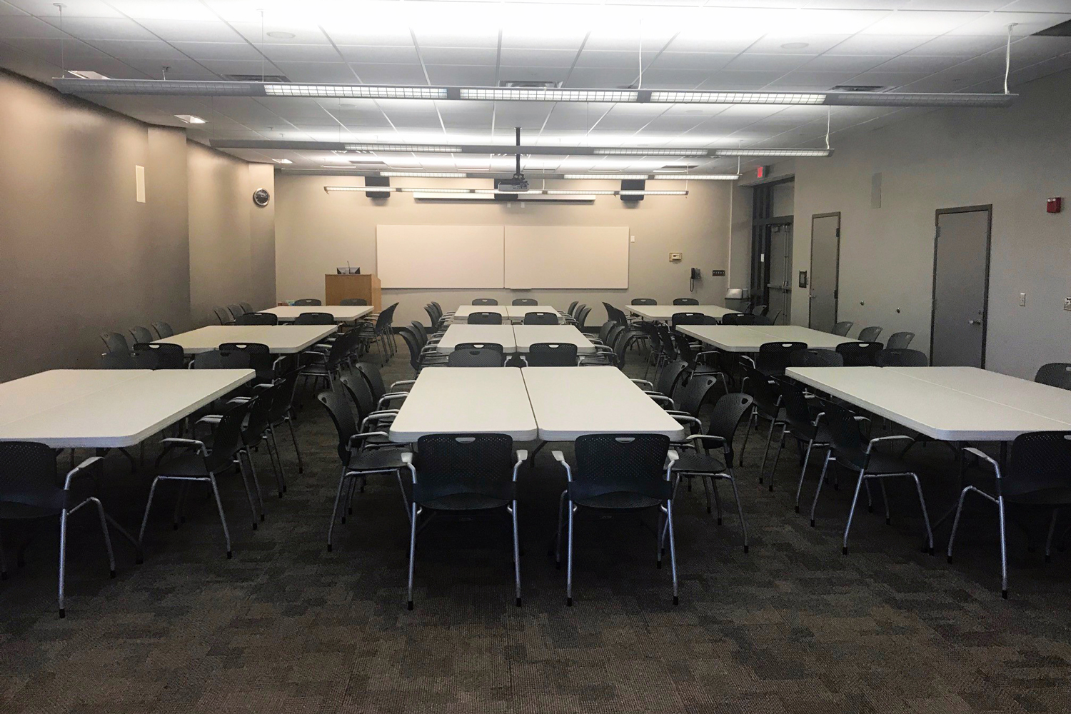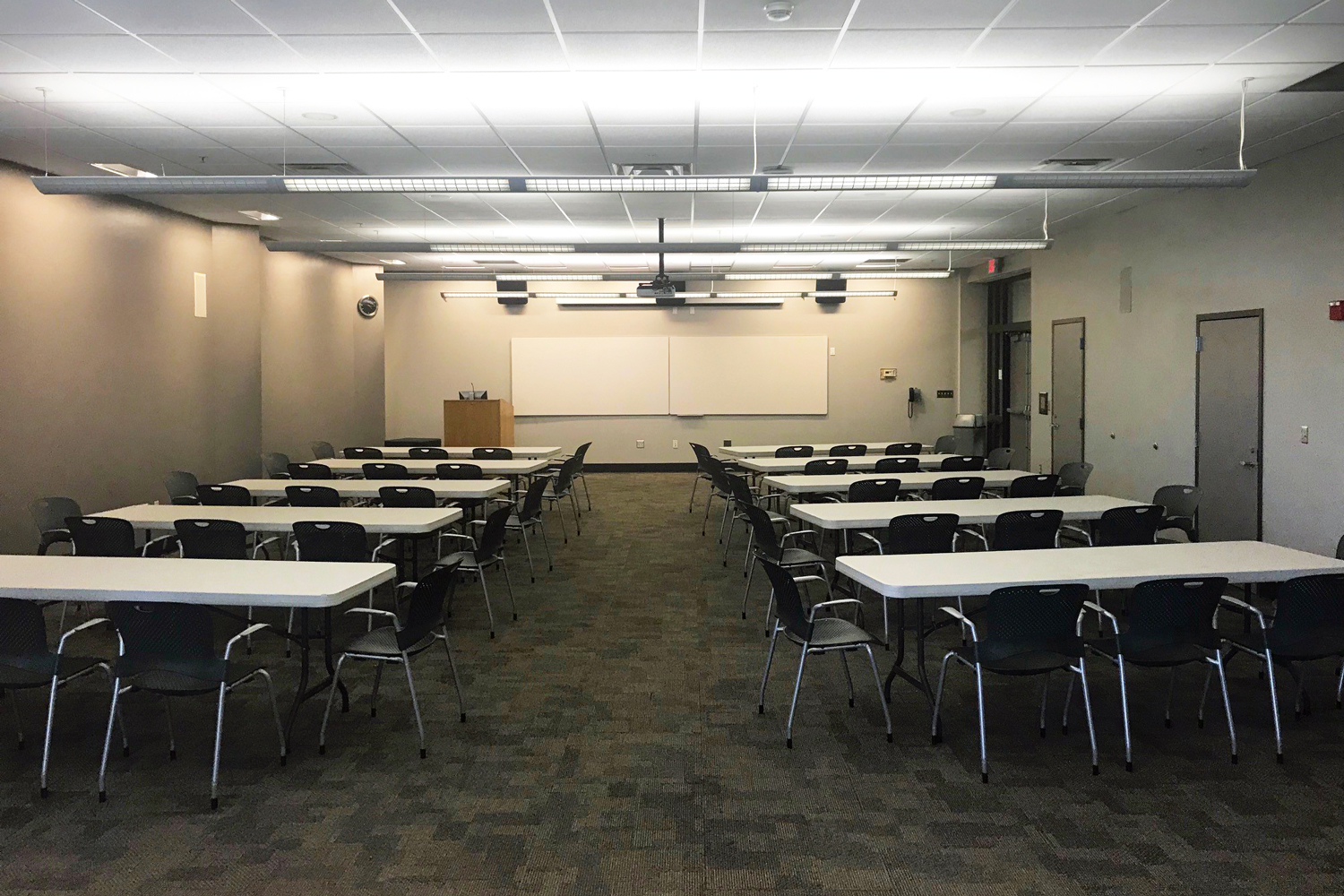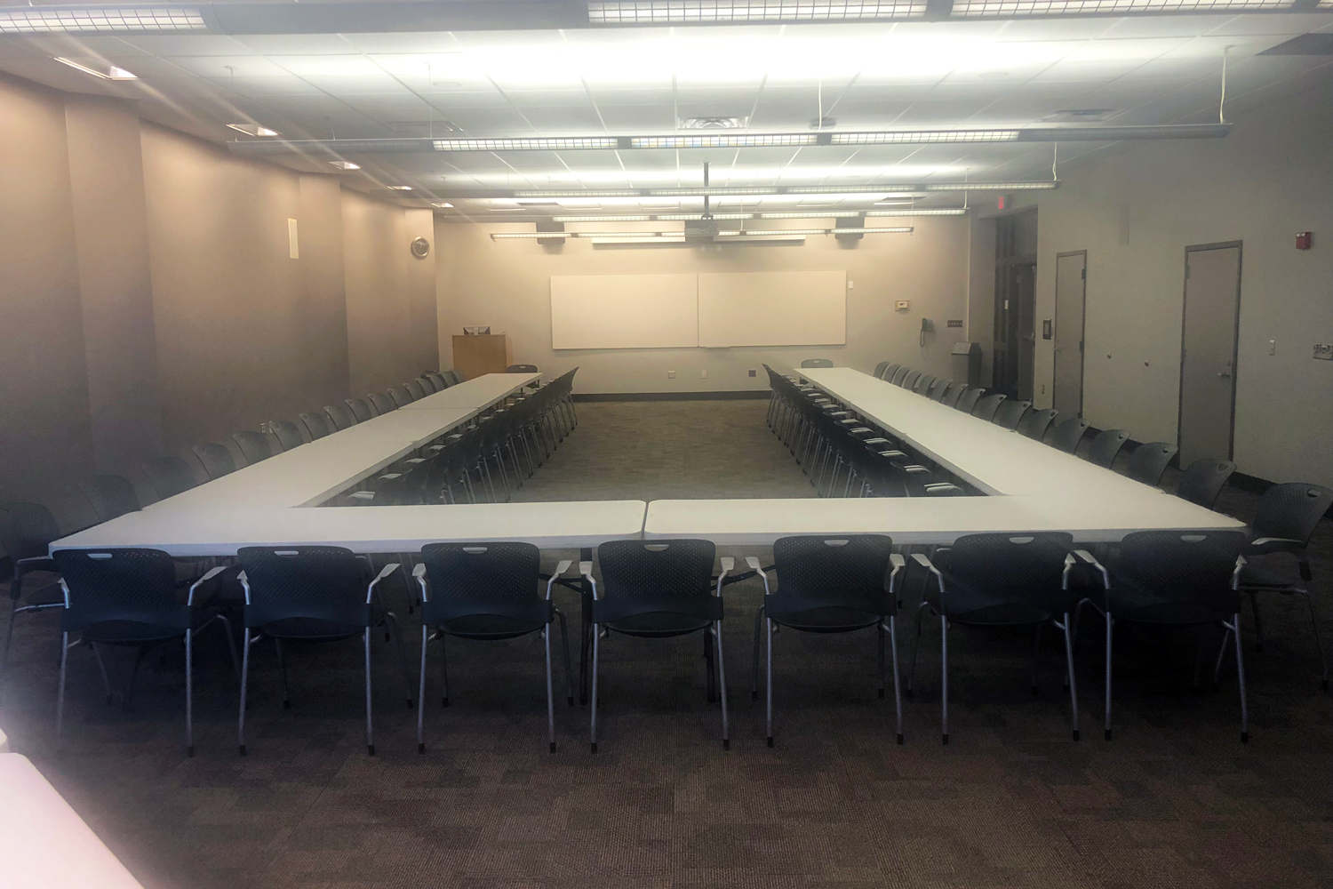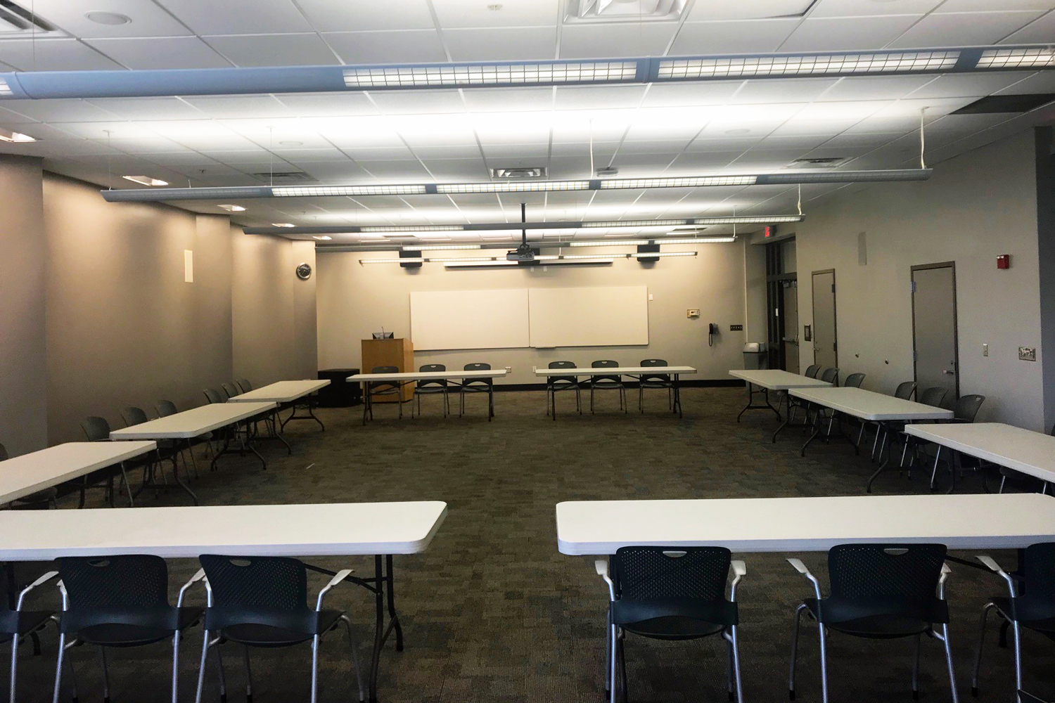 • Large Conference Room 116: Has audio and visual equipment and accommodates 20 to 50 people, depending on the setup. Patrons can choose between four setup configurations:
