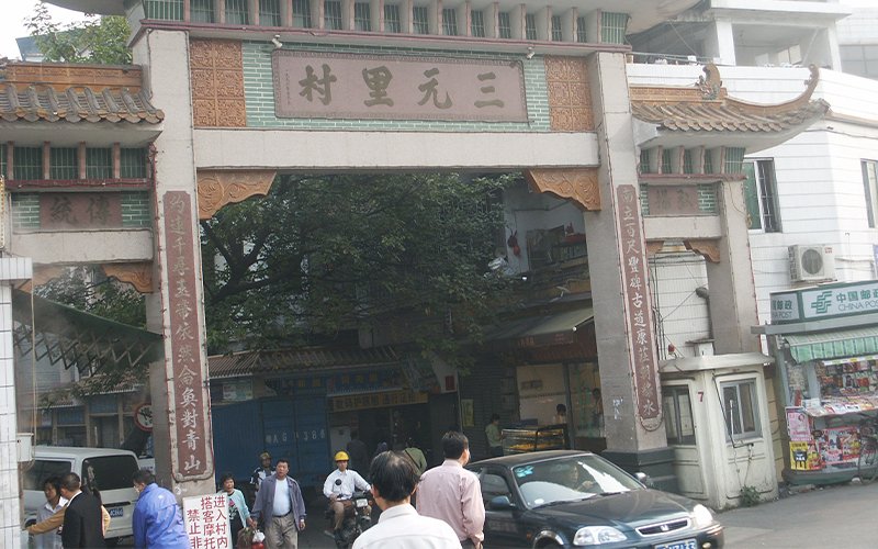 • A clay and green-brick archway hangs over a street in China, with deep brown Chinese lettering. Below, people and cars travel through the archway.