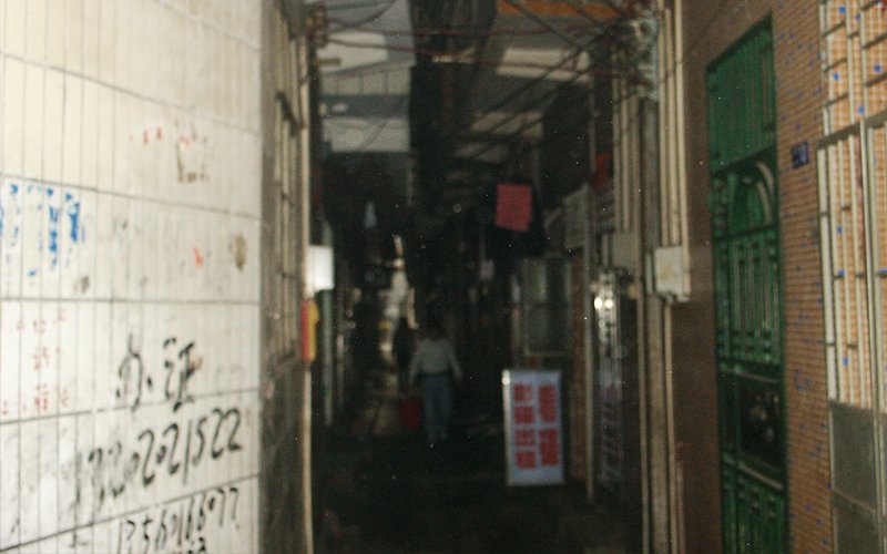• A person walks through an out-of-focus dark alley in China.