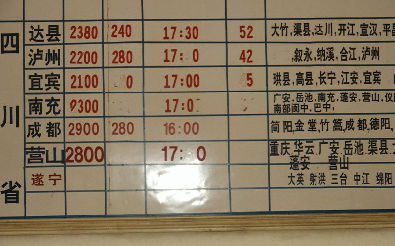 • A transportation schedule on a white board, displaying times and locations in white and red Chinese lettering.