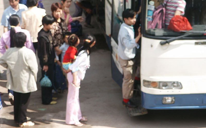 • A crowd of people waits by a shuttlebus in China. The image is slight out-of-focus.
