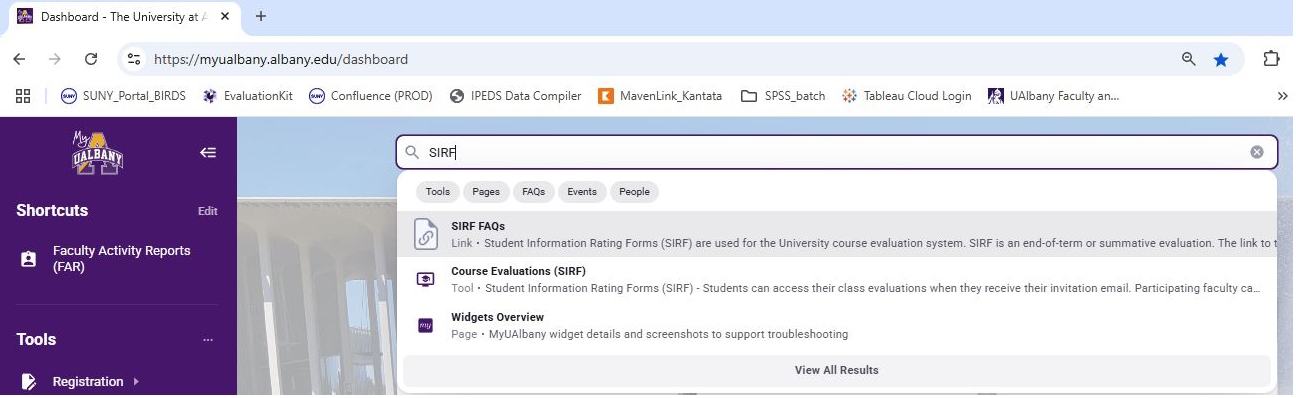 The Office of Institutional Research, Planning and Effectiveness manages the end-of-term course evaluation system with the UAlbany acronym SIRF (Student Information Rating Forms).