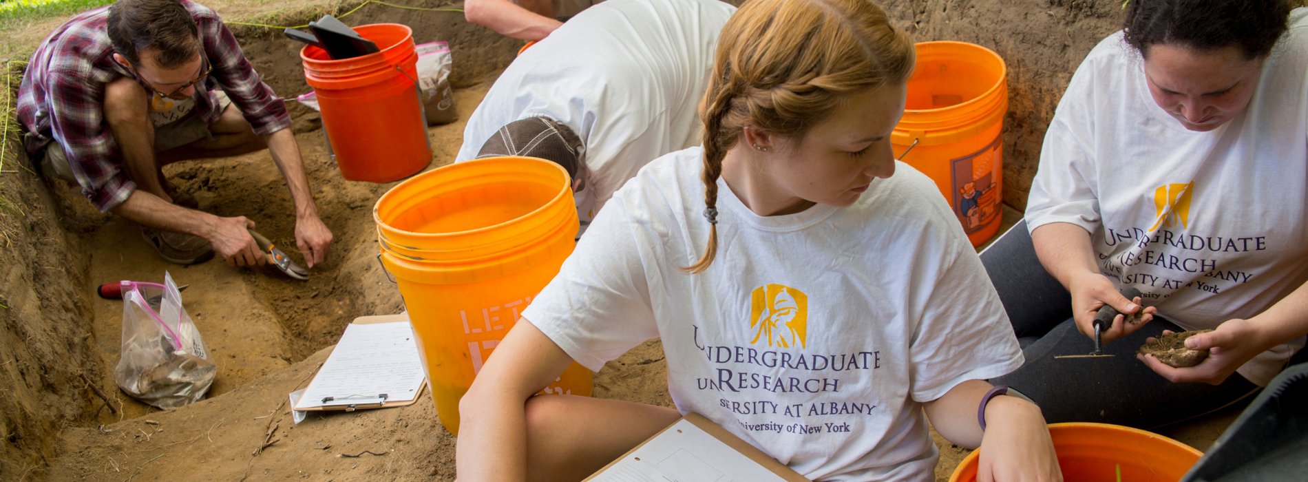 • Five students wearing Undergraduate Research t-shirts excavate artifacts at the archaeology dig. Five students wearing Undergraduate Research t-shirts excavate artifacts at the archaeology dig.