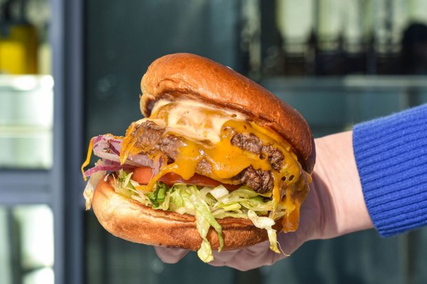 A hand holds out a double cheese burger with lettuce and tomato