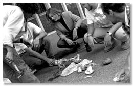 Marilyn Masson guides graduate students in her Zoo Archeology class to the proper method of cracking animal bones, used by indigenous peoples around the world since the Ice Age in order to extract marrow for food. The demonstration, conducted on the podium, served to illustrate the particular pattern of cultural breakage the students would encounter on archeological digs in such sites as the Iroquois in the northeastern U.S. as opposed to natural breakage of animal bone through erosion and other factors. Masson reports that the animal marrow, for the gatherers, was highly nutritious.