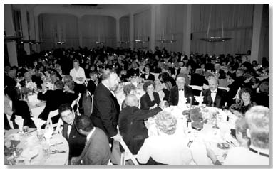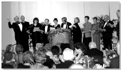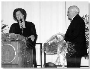 | Nov. 7: Karen Hitchcock is pleasantly surprised by a gift of flowers from her husband, Murray Blair, as he speaks to the Inaugural Dinner throng. | ![]() |