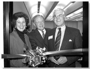 Nov.4: Ribbon-cutting occurred in the Business Buildings newly refurbished MBA classroom, courtesy of a contribution from the New York Business Development Corporation. Doing the honors are President Hitchcock, Donald Bourque, interim dean of the School of Business, and Robert Lazar, MS 77, president and CEO of NYBDC. |