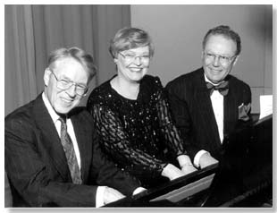 Nov. 3: Three presidents on a piano: David Porter of Skidmore, Jeanne Neff of Russell Sage, and James Hall of Empire State colleges perform a six-hand composition at the Presidential Concert. |