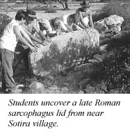One of the teams more dramatic finds was a late Roman sarcophagus lid found near Sotira (photo). Sarah Kozyra, a senior majoring in anthropology, said That was a particularly good day. Wed split up and about seven of us found a series of late Roman tombs a nice little cluster, but they had all been looted. There was this sarcophagus lid outside one of them. We flipped it over and there was a raised line going down the center for decoration. When you go out in the morning, you never know if youre going to find anything, and its exciting when you do.