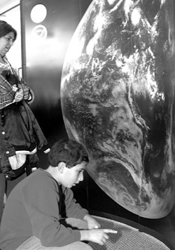 A young man checks out a global climatic model used by the National Weather Service and the Universitys Atmospheric Sciences Research Center.
