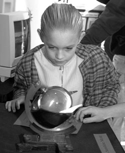 A youngster peers into another of the hands-on exhibits at the CESTM event.