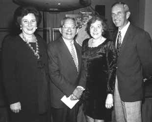 Winners of the 1997 Distinguished Service Medal stand with President Hitchcock at the Presidential Recognition Dinner. At left are Mr. and Mrs. Lawrence Gralla, parents of two graduates, founding members of the successful Parents Association and Parents Fun volunteers. To their right Richard Doc Sauers, head coach of the Great Danes basketball program for 41 years and one of only 11 coaches in college basketball history to reach 700 victories . Not present to receive his award was Timothy O. White, publisher of the Times Union newspaper, who lent support to the Universitys efforts to build CESTM and bring the New York Giants summer camp to campus. The medal is conveyed by the University Council to recognize specific acts or actions by a citizen or public official which benefits the course of public higher education in the state and/or materially enhances the standing and capability of the University.
