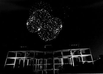 Fireworks mark the spot, as the new University Library is officially topped off on Saturday night, Oct. 18, before a crowd of alumni, parents and students.