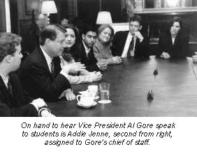 Jenne, who was assigned to the office of the chief of staff for Vice President Al Gore, worked primarily for Albany graduate Michael Burton, Ph.D.�95, special assistant to the chief of staff. She researched events, wrote letters, made phone calls, photocopied documents, circulated information and sorted mail.