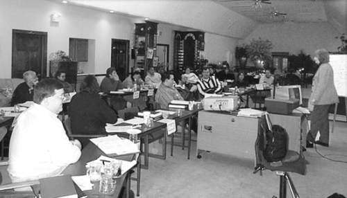 University professor of management, Cecelia Falbe, instructs an MBA class at the Wayside Inn conference center, just outside of Saratoga Springs.