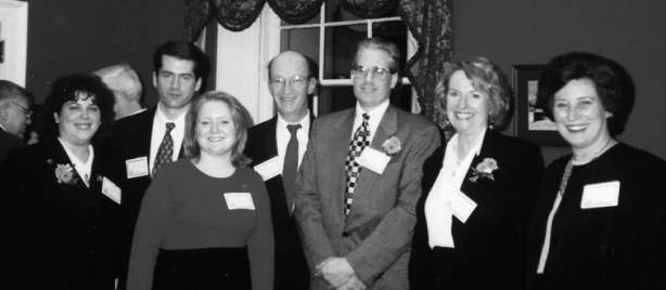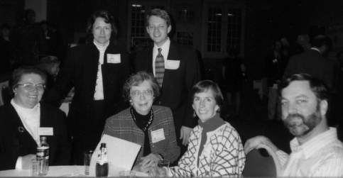 President Hitchcock, right, met with Albany alumni in a March 26 event at the Longworth House Office Building in Washington D.C. Among the 85 on hand at the "University at Albany Alumni in Government" reception were, in photo, left to right, Patty Salkin '85, president of the Alumni Association; John Malitzis '89, D.C. chapter leader, Addie Jenne, a current University sophomore now interning in Vice President Al Gore's office, Roger Rapp '68, director of field operations for the National Cemetery Systems in the Department of Veterans Affairs; Gil Klinger '81, Undersecretary of Defense in the U.S. Department of Defense, and Linda Wilbur '73,director of policy and budget staff for the Environmental Protection Agency.