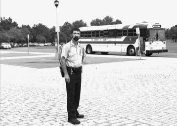 Todd Grant, a UPD security officer, stands at the department's new fixed post at Collins Circle, which will be manned daily from sunset to the last bus' departure.