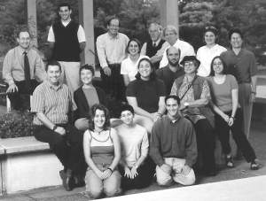 "Foundations of Great Ideas" faculty and peer mentors; front row, from left: peer mentors Lorin Young, Maxine Oland, Paul Alan Rosen; middle row: Professors Helmut Hirsch and Helen Ghiradella, peer mentor Marianne Della Croce, Professors Lee Bickmore and Judith Johnson, peer mentor Christina Esposito; back row: Professor Max Lifchitz, peer mentor Paul Mozer, Dean John Pipkin, peer mentor Jennifer Bauder, Professors Gary Gossen and Morton Schoolman, peer mentor Mary Sass, Professor Roberta Bernstein. (Gary Gold photo.)