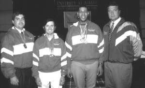 The New York Special Olympics Summer Games will return to the Albany campus for June of 1999 and 2000, it was announced on September 17 by Neil J. Johnson, president and CEO. Attending the press conference at the RACC were, left to right, Special Olympics coach John Grathwol, Special Olympics athletes Jim Vinson and Lenny Brewer, and former Olympic Gold Medalist Jeff Blatnick, an NYSO honorary coach.
